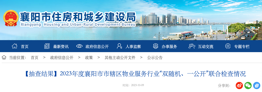 據襄陽市住房和城鄉建設局網站10月9日公布的抽查結果顯示,2023年度襄陽市市轄區物業服務行業“雙隨機、一公開”聯合檢查情況如下: