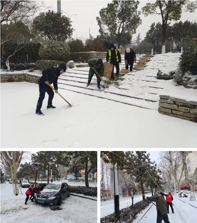 凍雨剛落,迅速安排人員融冰除雪,最大限度防止凍雨凝結(jié)成塊。2月20日晚上10點、12點,21日凌晨5點分別出動人員機械除冰除雪,其中市政管理處14支應(yīng)急隊伍共計272人趕至市區(qū)14座人行天橋,橋管中心6支應(yīng)急隊伍反復(fù)在大型橋梁上除冰除雪,建管中心全員出動到襄江大道高架除冰除雪,各公園廣場、綠化養(yǎng)護單位提前做好植物防寒保暖工作,全員出動鏟雪除冰,各安全監(jiān)管單位加強建筑工地施工安全巡查管控,全力筑牢住建領(lǐng)域安全防線。加強對各住宅小區(qū)物業(yè)指導(dǎo)和公租房小區(qū)設(shè)施設(shè)備排查,動員352家物業(yè)服務(wù)企業(yè),發(fā)動3000余名物業(yè)服務(wù)人員開展除冰掃雪,動員所有在襄建筑業(yè)企業(yè)出動933人、50臺鏟車、13臺裝載機、20臺渣土車對城區(qū)主要道路、橋梁及人行道進行除雪作業(yè)。