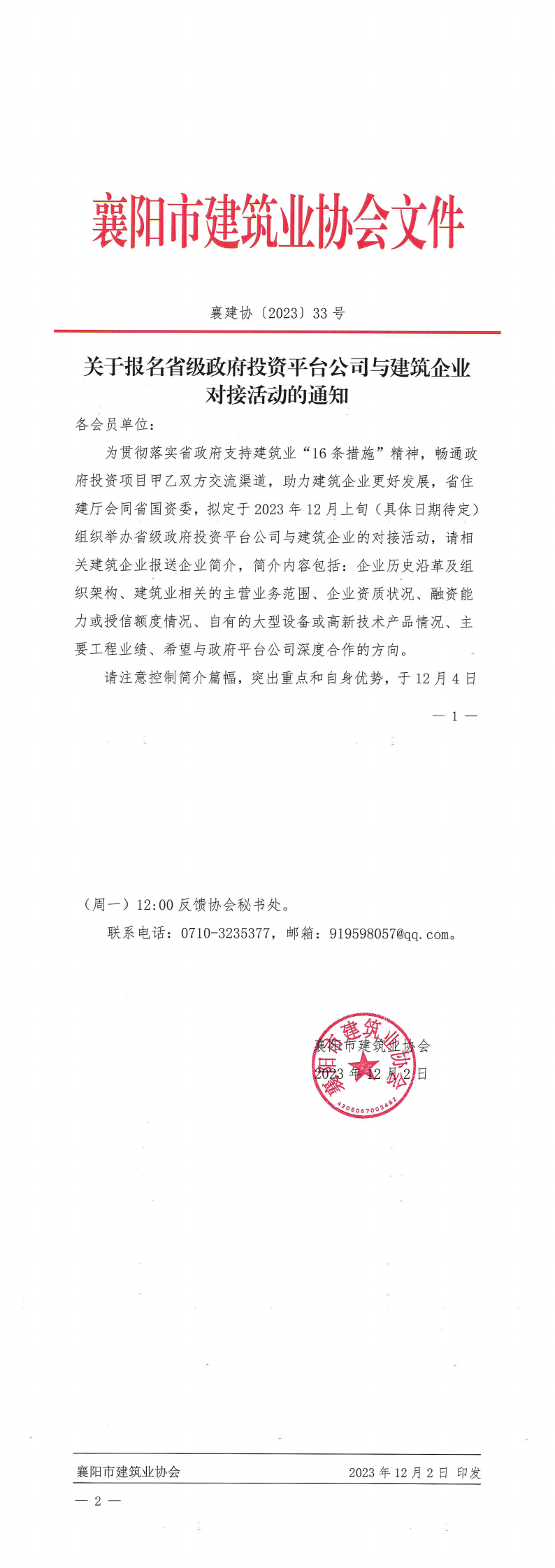 為貫徹落實(shí)省政府支持建筑業(yè)“16條措施”精神,暢通政府投資項(xiàng)目甲乙雙方交流渠道,助力建筑企業(yè)更好發(fā)展,省住建廳會(huì)同省國資委,擬定于2023年12月上旬(具體日期待定)組織舉辦省級(jí)政府投資平臺(tái)公司與建筑企業(yè)的對(duì)接活動(dòng),請(qǐng)相關(guān)建筑企業(yè)報(bào)送企業(yè)簡(jiǎn)介,簡(jiǎn)介內(nèi)容包括:企業(yè)歷史沿革及組織架構(gòu)、建筑業(yè)相關(guān)的主營業(yè)務(wù)范圍、企業(yè)資質(zhì)狀況、融資能力或授信額度情況、自有的大型設(shè)備或高新技術(shù)產(chǎn)品情況、主要工程業(yè)績(jī)、希望與政府平臺(tái)公司深度合作的方向。