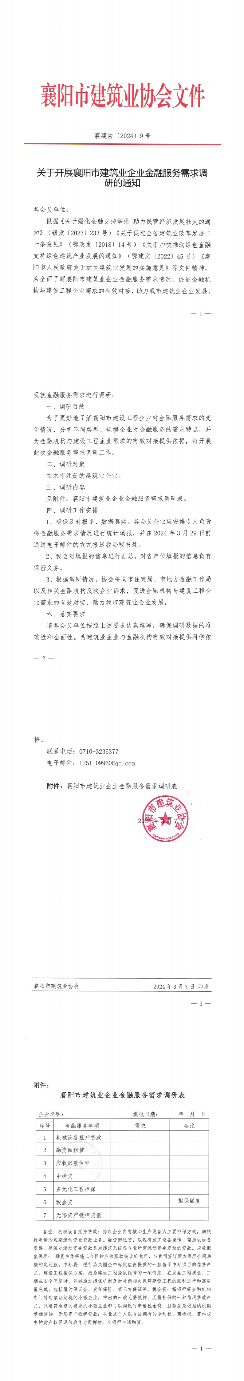 見附件:襄陽市建筑業(yè)企業(yè)金融服務(wù)需求調(diào)研表。