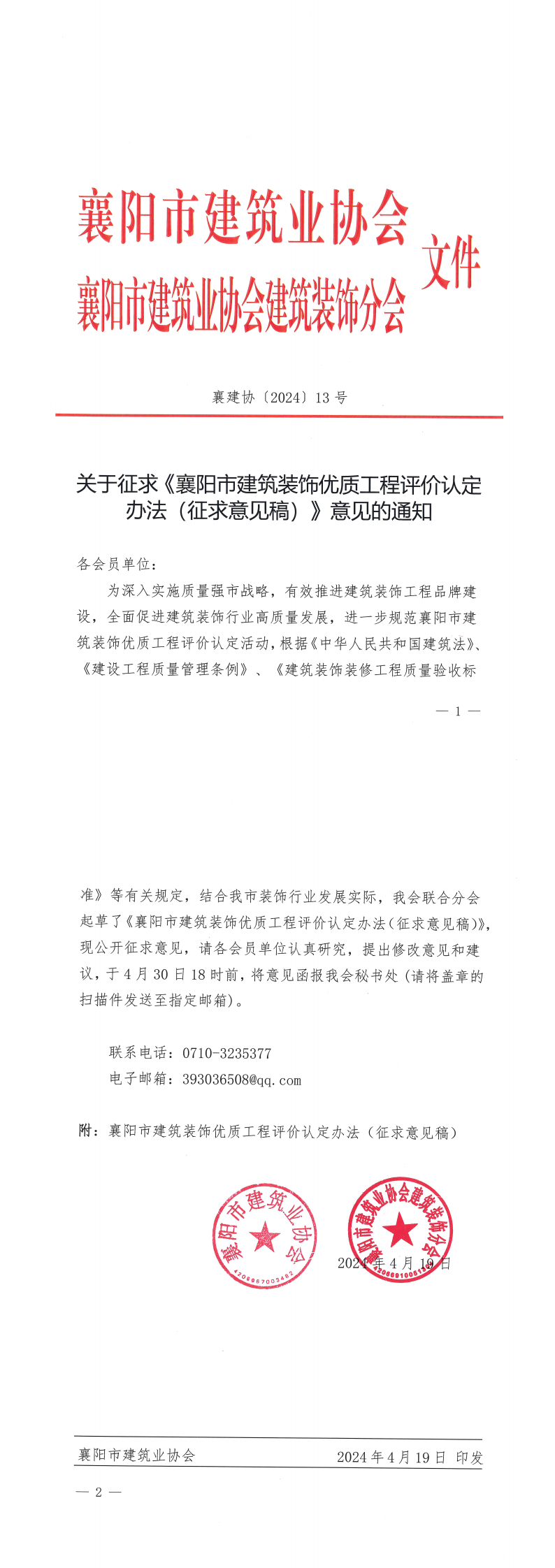 關于征求《襄陽市建筑裝飾優質工程評價認定辦法(征求意見稿)》意見的通知