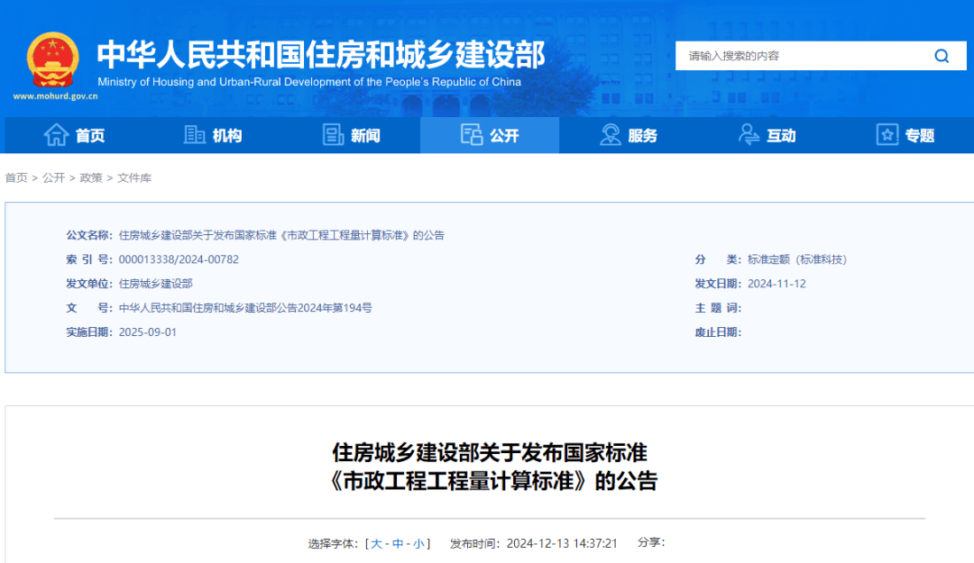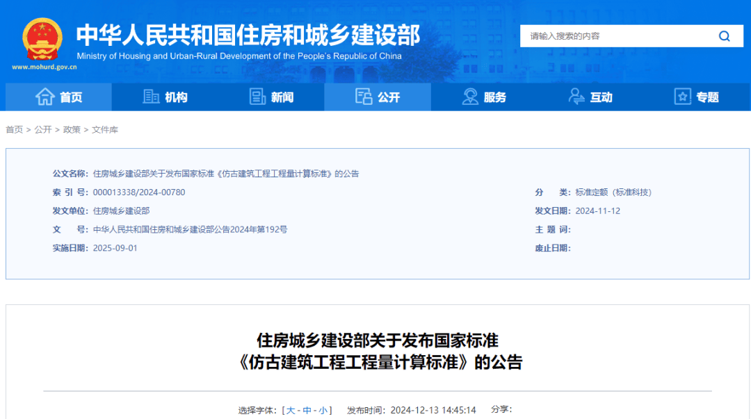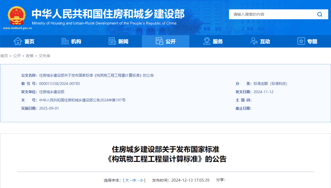 12月13日,住建部公布 9項國家標準,分別為 房屋建筑與裝飾工程、仿古建筑工程、通用安裝工程、 市政工程、園林綠化工程、礦山工程、構筑物工程、城市軌道交通工程和爆破工程, 自2025年9月1日起實施,原標準同時廢止。