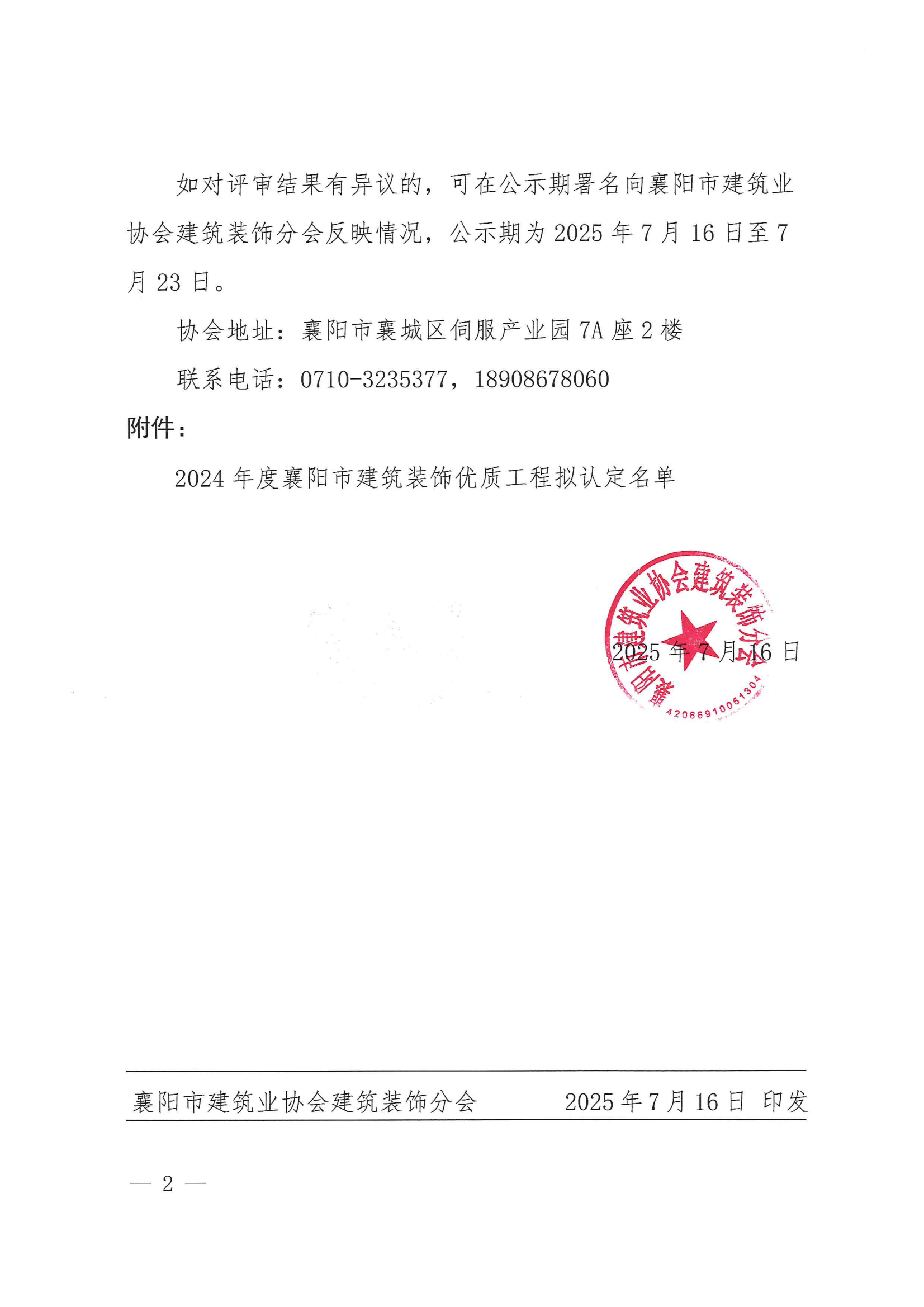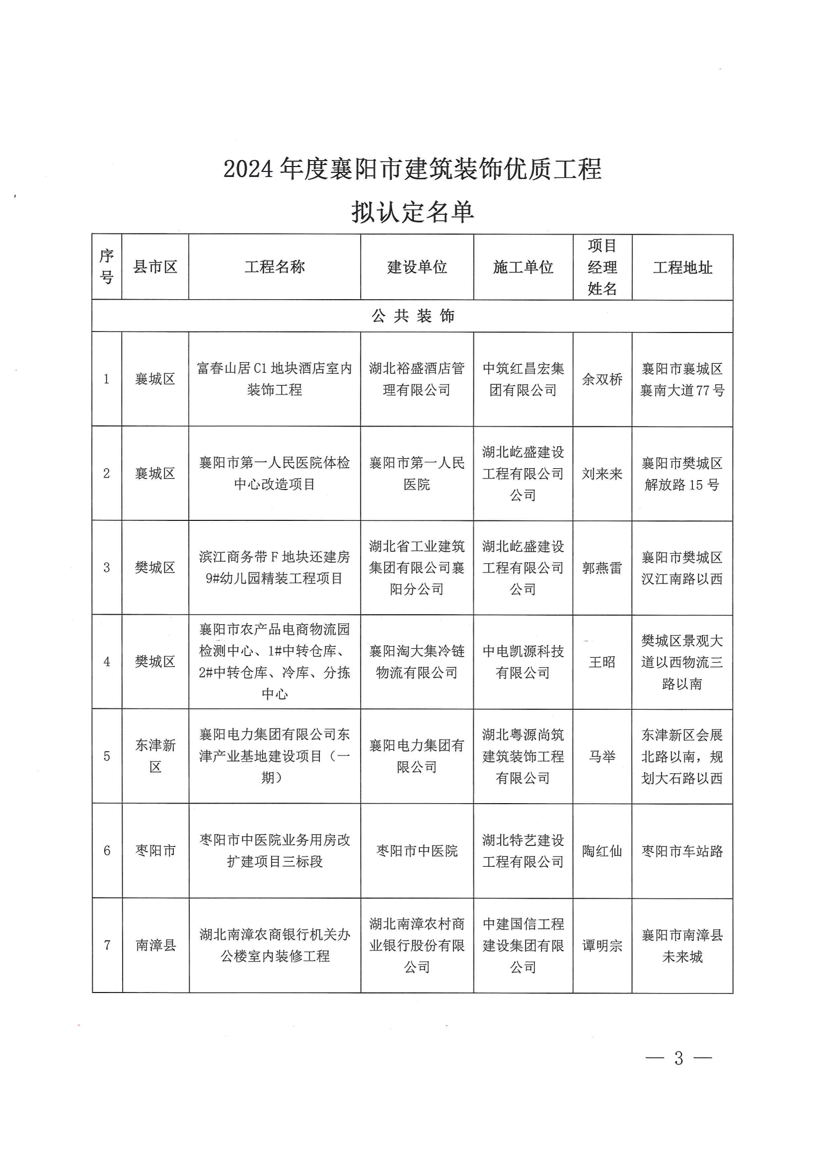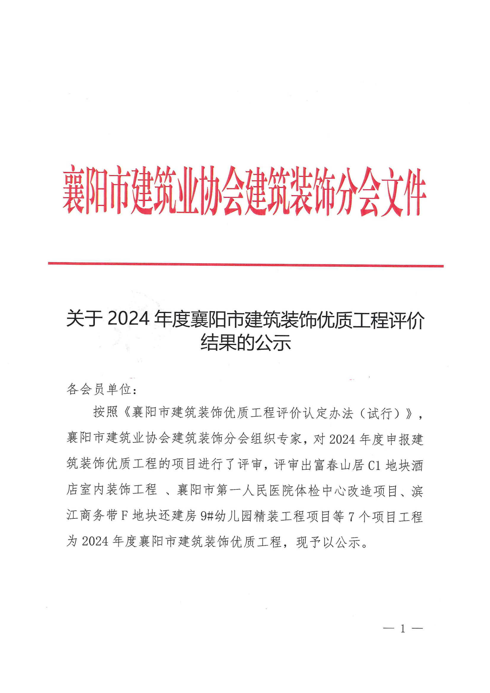 關(guān)于 2024 年度襄陽市建筑裝飾優(yōu)質(zhì)工程評價結(jié)果的公示