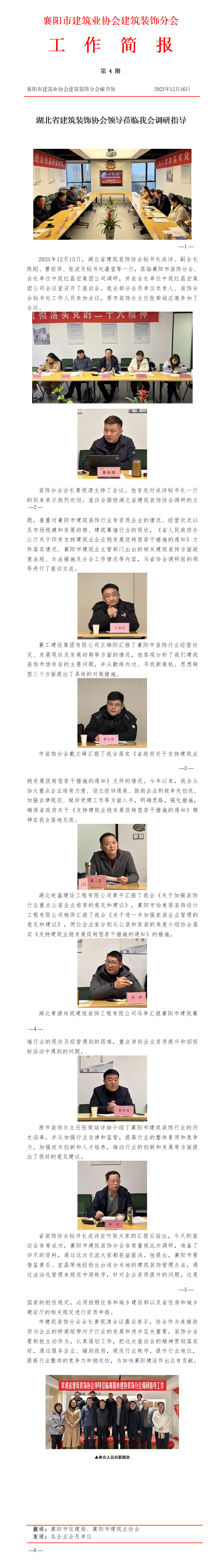 2023年12月15日,湖北省建筑裝飾協會秘書長成詩、副會長陳剛、曹麗萍、張波及秘書處潘瑩等一行,蒞臨襄陽市裝飾分會、會長單位中筑紅昌宏集團公司調研,并在會長單位中筑紅昌宏集團公司會議室召開了座談會。我會部分會員單位負責人、裝飾分會秘書處工作人員參加會議,原市裝飾辦主任張榮斌應邀參加了會議。