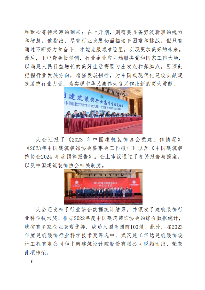 大會匯報了《2023 年中國建筑裝飾協會黨建工作情況》《2023年中國建筑裝飾協會監事會工作報告》以及《中國建筑裝飾協會2024 年度預算報告》。會上審議通過了相關報告與提案,以及中國建筑裝飾協會相關制度。