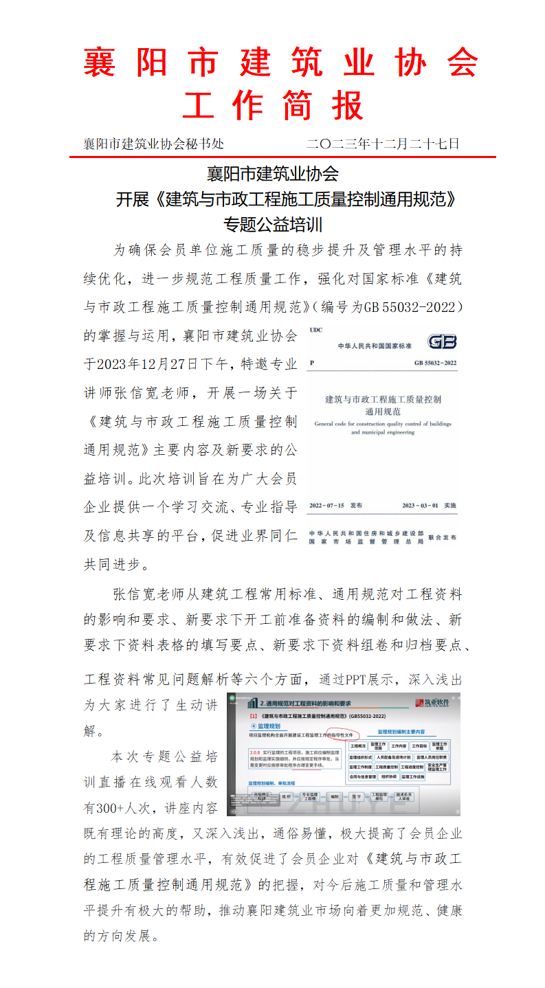 襄陽市建筑業協會開展《建筑與市政工程施工質量控制通用規范》專題公益培訓
