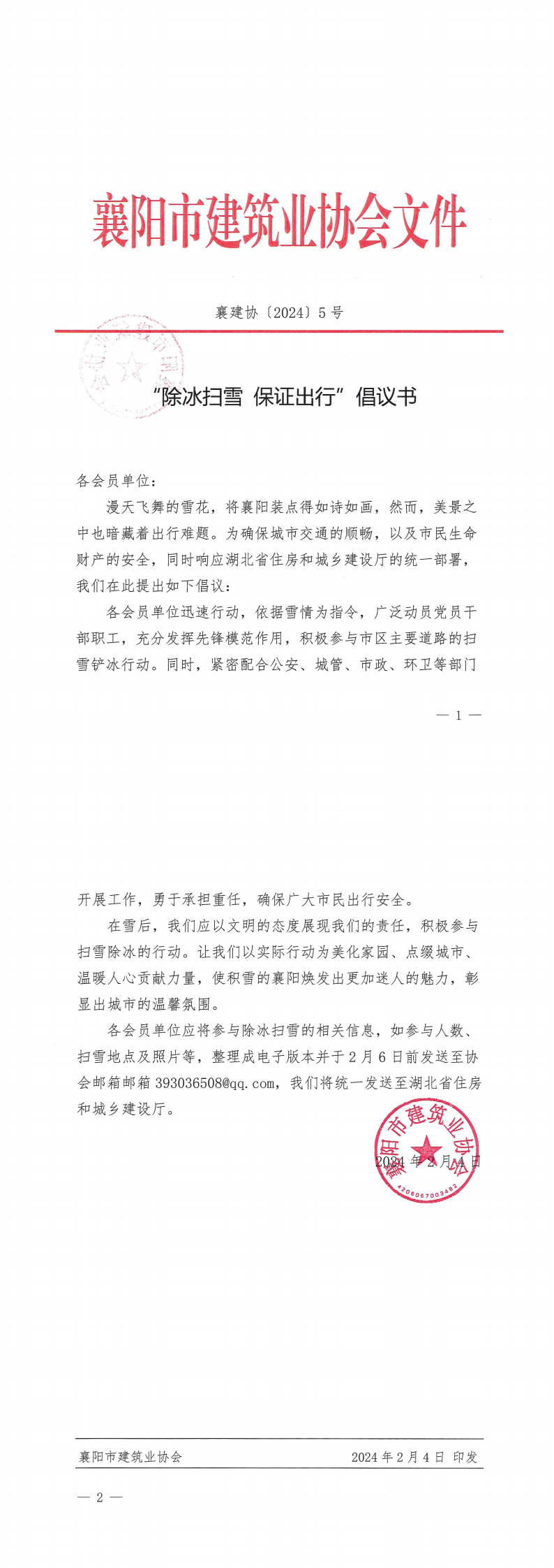 各會(huì)員單位應(yīng)將參與除冰掃雪的相關(guān)信息,如參與人數(shù)、掃雪地點(diǎn)及照片等,整理成電子版本并于2月6日前發(fā)送至協(xié)會(huì)郵箱郵箱393036508@qq.com,我們將統(tǒng)一發(fā)送至湖北省住房和城鄉(xiāng)建設(shè)廳。