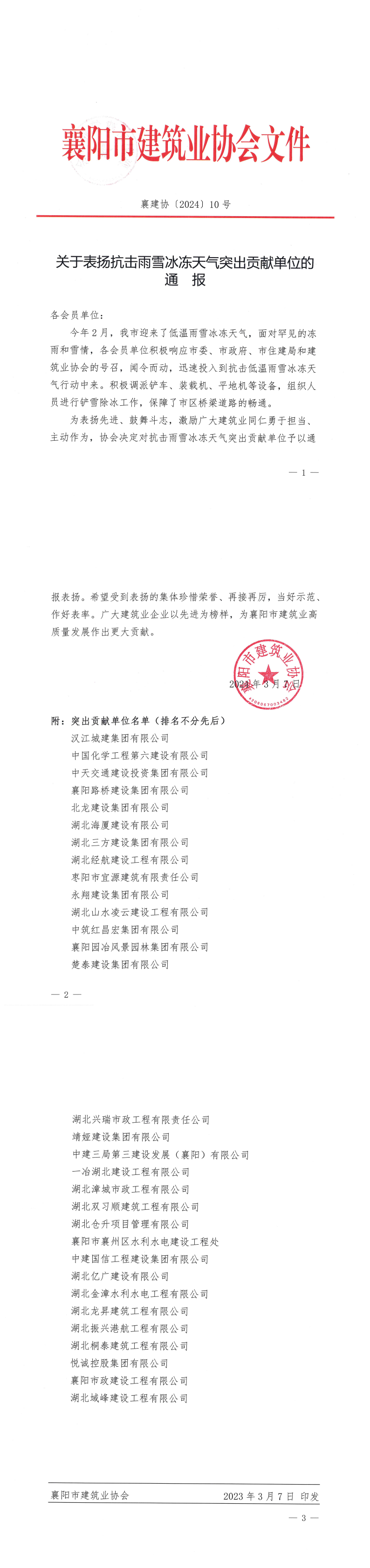 襄建協〔2024〕10號關于表揚抗擊雨雪冰凍天氣突出貢獻單位的通報